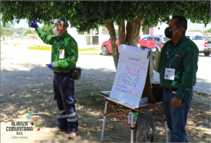 Este fin de semana el presidente municipal, José Felipe Prado Bautista en compañía del Secretario General de Gobierno, Ramiro González Navarro, se reunieron con Francisco Javier Martínez, Ramón Alvarado y Christian Zavala representantes de la Alianza Comunitaria en la comunidad de Vizcaíno, para lograr el convenio. Posterior a esta reunión Christian Zavala, Coordinador Estatal de Capacitación para la Alianza dirigió la capacitación en bio-seguridad y georeferenciación a los voluntarios que de inmediato empezaron con la repartición de la ayuda alimentaria.